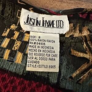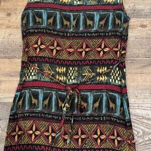 Keywords: Just in Thyme, midi dress, sleeveless, multicolor, Giraffe print, bohemian, rayon, scoop neck, tie waist, spring fashion, women's dress, casual wear, vintage style, adjustable fit, pre-owned.