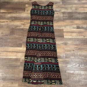 VTG 90s Just in Thyme Sleeveless Midi Shift Dress 8 Tie Back Giraffe Geo Print