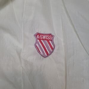 Vintage 90s K-Swiss mens L white nylon cropped windbreaker boxy fit pastel pink crest logo USA made tennis jacket shop now