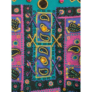 Shirt is one size fits most and has beads, rhinestones, and hand painted designs on it. Measures 23 inches armpit to armpit and is 31 inches long.