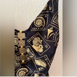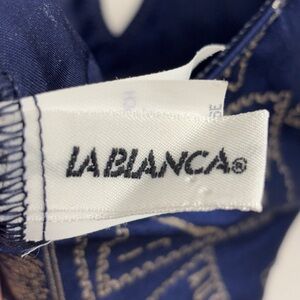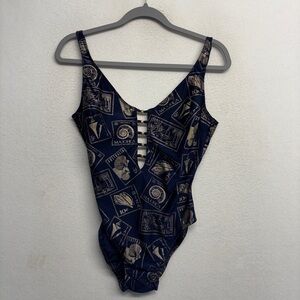 VTG 90s La Blanca Navy Blue One Piece Swimsuit 12 travel Stamp Metallic Print
