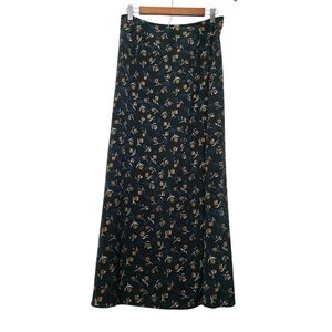 Elevate your wardrobe with this authentic Vintage 90s La Fete Maxi Skirt. This elegant piece features a beautiful dark floral ditsy print in a sophisticated color palette of dark blue and brown/orange floral, perfect for any occasion.