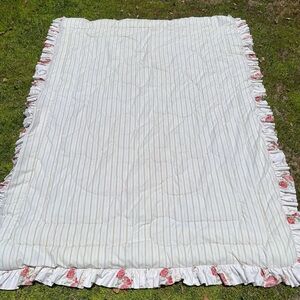 Vintage Laura Ashley Ruffled Reversible Twin Size Comforter. Pink Cottage Rose Floral on one side and Pink and Green stripes on the other. 4” ruffles on 3 sides. Thick batting and quilting, making this a nice weight, fluffy comforter. Made in USA, 90s era. This is a hard-to-find pattern! Beautiful cottage, country nostalgia!