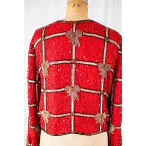 Festive vintage 90s Laurence Kazar beaded holiday cardigan top featuring a red background with sparkling silver beaded Christmas bows throughout. This blazer-style jacket closes with hook-and-eye fastenings down the front and is incredibly eye-catching, perfect for holiday parties, Christmas photos, or festive events. Very sparkly and beautifully made, as expected from Kazar pieces. 100% silk outer shell, lining: polyester.