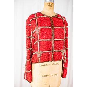 VTG 90s Laurence Kazar Beaded Christmas Blazer Red Silver Holiday Bow Jacket PXL