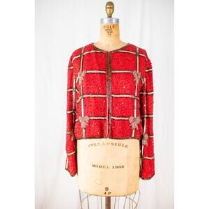 Vintage 90s Laurence Kazar Beaded Christmas Blazer, Red Silver Holiday Bow Jacket, Festive Sequin Top, Plus XL PXL