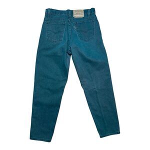 The product is a pair of vintage 90s Levi's 505 Forest Green jeans in size 31x29, featuring the iconic orange tab and tapered style. Made in the United States, these denim pants are a classic addition to any man's wardrobe, perfect for those looking for a retro feel with a modern twist. The forest green color adds a unique touch to these timeless jeans, making them a standout piece for any fashion-conscious individual.