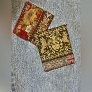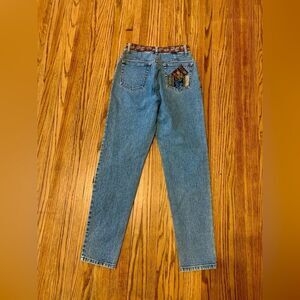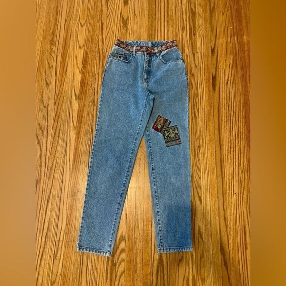 Amazing one of a kind vintage 90s 2000s y2k super high rise straight leg medium wash jeans from The Limited. Unique patchwork applique design with sewn on floral medieval silk fabric patches on leg, pockets and waistband.