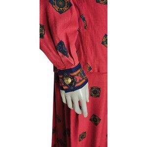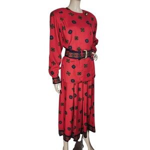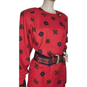 Vintage 90s Liz Claiborne blouse with a unique medallion print, featuring a high shoulder design and has original belt in same print as the hem of the skirt and blouse, has shoulder pads (easily removed) size 10.
