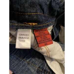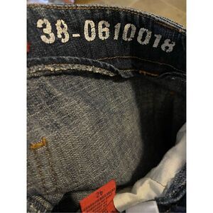 Retro 90s Y2K early 2000s fit high-rise with baggy oversize silhouette made to fit long and bag up at the ankles made of quality, sturdy hundred percent cotton denim in a dark wash with brown stitching, and brown Velcro strap monogram detailing, very unique pair of skater punk, rock jeans sz 42 x 34