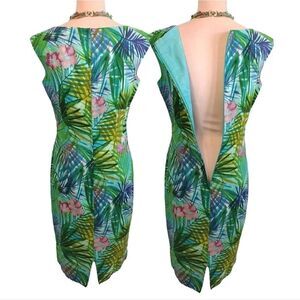 Beautiful teal color, with vibrant colorful tropical Hawaiian prints (in pink, green, yellow, orange, blue & purple). Sleeveless, with a stylish square neckline. Hourglass fitted. Mini, above the knees length, with a mid- back slit. Hidden back, matching teal ykk zipper, closure. Fully lined. Perfect vacation dress!