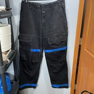 These do have some distressing on the bottom of the hems probably from someone using them as skateboarding jeans. They have super wide legs and deep thigh pockets. They have blue straps on the thighs and legs to make them skinnier. These are heavy.