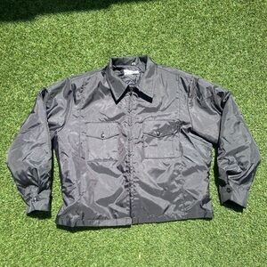 Stylish cool Vintage 90’s Mens Black Flight Jacket , simple black jacket with detachable inner flight jacket lining, collared neck almost like a security jacket . Patches removed from arms , minimal wear .