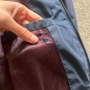 The inside lining by the interior pocket has a small hole on the outer layer of the lining / the hole does not go all the way through since it’s double lined. See photos for visual. Besides for that, the jacket is in excellent pre loved condition with no other flaws to note.
