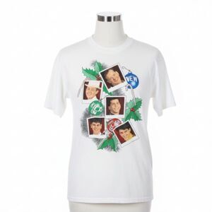 RARE VTG Vintage collector's item - Have a funky, funky Christmas with this New Kids on the Block NKOTB short sleeve t-shirt top by Prentiss from the 1990s, featuring Joey McIntyre, Donnie Wahlberg, Jordan Knight, Jon Knight, and Danny Wood pictured on the front with their names written on Christmas stockings on the back. It's a ho ho ho and oh, oh, oh-oh-oh time of year! Tee is in excellent pre-owned condition, Made in the U.S.A. from 100% cotton.