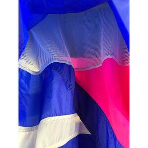 This vintage Nike windbreaker offers a retro colorblock design in vibrant blue, pink, and white. Its lightweight material and zip closure provide comfort and style.