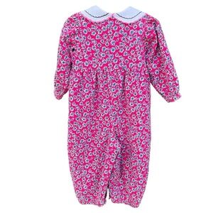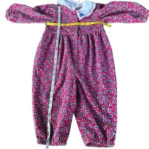 Vintage 90’s OshKosh B’Gosh Corduroy Floral Long Sleeve Jumper. Raspberry Pink with Blue and Purple floral print. Scalloped Peter Pan collar with floral embroidery. Button front closure with snaps at the legs for easy diaper changes. Absolutely adorable and peak 90’s baby wear in a hard-to-find Pink color. Great vintage condition with no holes or staining. Very minor wash wear/fade. The elastic at the ankles is no longer stretchy. Size and material tag was cut out. This measures as an approximate 2T, but measurements are listed for best fit.