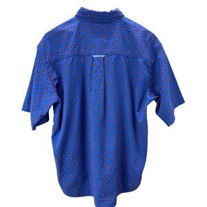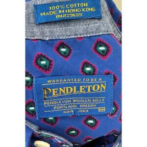 Step back in time with this awesome vintage 90s Pendleton short sleeve button-down shirt! This blue shirt features a unique multicolor allover geometric print that's sure to turn heads. It's in great pre-owned condition, ready for its next adventure.