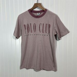 Step back into the 90s with this vintage Polo Club International striped T-shirt. Features a maroon and white stripe pattern, bold front graphic, and contrast ribbed crewneck. Constructed with soft 100% pre-shrunk cotton and single-stitch hems, made in the USA. Perfect for vintage streetwear collectors or fans of minimalist retro style.