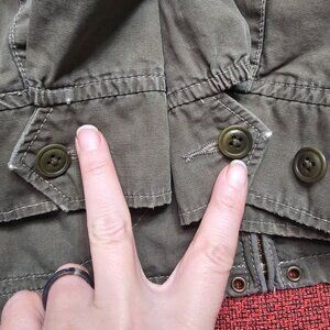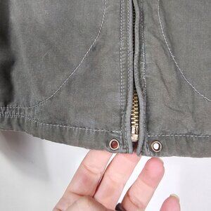 Pre-owned good condition. There is a place for a drawstring at the bottom hem, but no drawstring. There is some color distressing, and some wear at the cuffs, see all pictures.