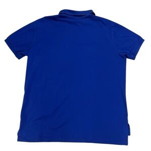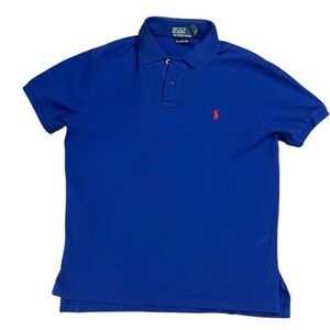 Vintage 90’s Polo by Ralph Lauren men’s banded short sleeve polo shirt. 97% pima cotton stretch blend with mesh/pique finish. Royal blue with red pony. Tennis high/low hem. Custom Fit style.