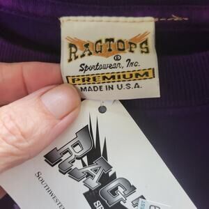 This product is a vintage 90's Ragtops Native American style short sleeve t-shirt in size XL. The shirt features a purple color with a design that reflects a Native American theme. Made for men, this regular fit t-shirt is a unique and stylish addition to any wardrobe. Perfect for those who appreciate vintage fashion and indigenous designs.