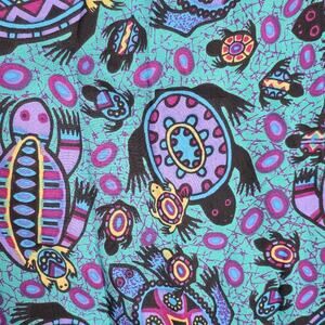 Made from soft 100% rayon with a flowy drape, they feature a bold allover turtle print in teal, purple, and black.