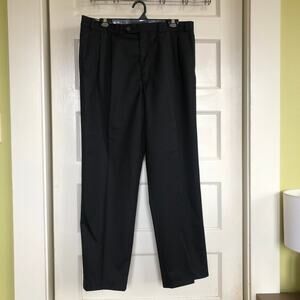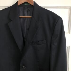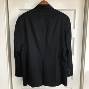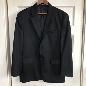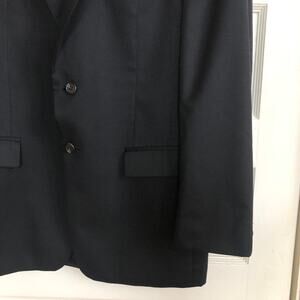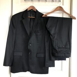 Keywords: wool cashmere blend, made in canada suit, black 2 button blazer, matching trousers, 42 regular, dress suit, wedding guest suit, business professional