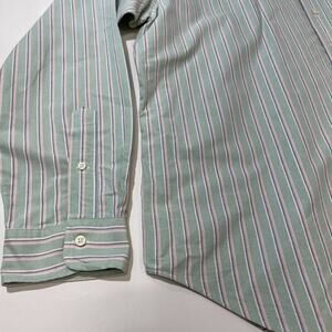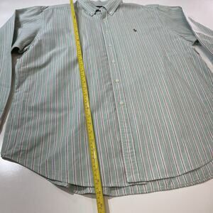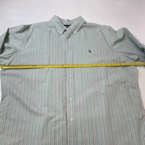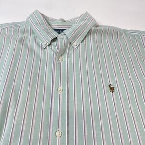 The product is a vintage 90s Ralph Lauren Men's XXL Yarmouth Oxford Striped Button Down Shirt in size 2XL. This classic shirt features a multicolor striped pattern, long sleeves, a collared neckline with a button-down collar style, and is made of cotton material. Perfect for men's casual wear, this retro button-up shirt exudes a 90s vibe with the iconic Ralph Lauren brand.