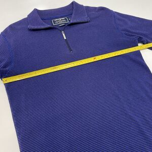 This product is a vintage men's Polo Sport rugby shirt from the 90s, made by Polo Ralph Lauren. It has a purple striped pattern and a collared neckline with a 1/4 zip closure. The shirt is made of 100% cotton jersey fabric and has short sleeves with an embroidered logo accent. It is a size M with a slim fit and a chest size of 38 inches. The shirt has a length of 27 inches and features a vintage style. It is suitable for various occasions such as travel, party/cocktail, and casual wear.