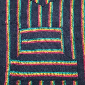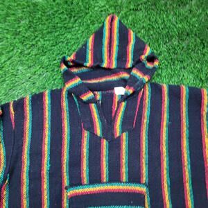 VTG 90S RASTA BAJA HOODIE WOMENS L XL, VINTAGE DRUG RUG RASTA STRIPE HOODIE, BOXY CROPPED MEXICAN BAJA PULLOVER, WOVEN KANGAROO POCKET V NECK HOODIE, REGGAE COLORS RED YELLOW GREEN HOODIE, RASTA BAJA, DRUG RUG, VINTAGE HOODIE, SERAPE HOODIE, BOHO SWEATER