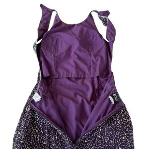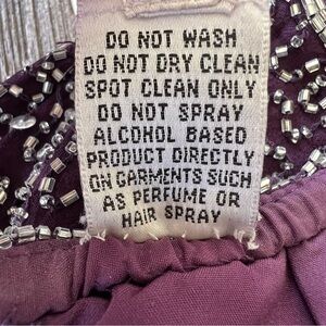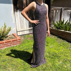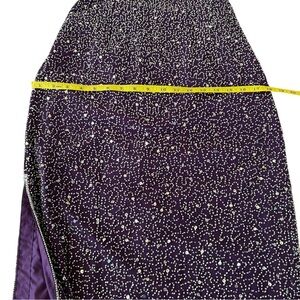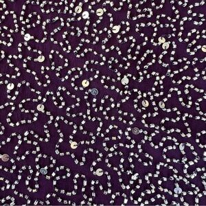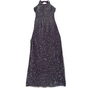 Vintage 90s Romy Scala Beaded and Embellished Formal Backless Halter Dress. Women’s size medium. Plum Purple color encrusted with clear and silver beads and sequins. 100% silk, fully lined with built-in modesty pads. Zip closure at back with hook and eye closure at neck. Classic 90s style. Shimmery and sparkly-beautiful!