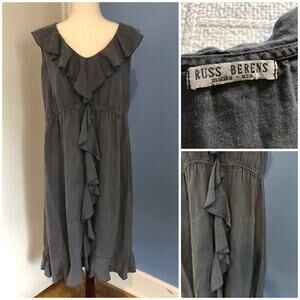 Keywords: Russ Berens dress, 90s gray midi dress, made in USA dress, ruffle front midi, vintage minimalist style, coastal grandmother outfit, washed cotton dress, resort chic summer dress, quiet luxury vintage, neutral ruffle dress, romantic coastal