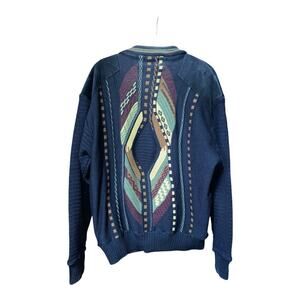 VTG 90s Saxony Leather Knit Sweater HipHop Coogi Style multicolor Texturized SzL
