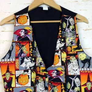 Pre-owned condition, VTG 90s Smoke Valley Halloween Theme Vest Women L/XL Dracula Witch Skeleton Owln. 100% Cotton front, 100% Acetate Back and lining.