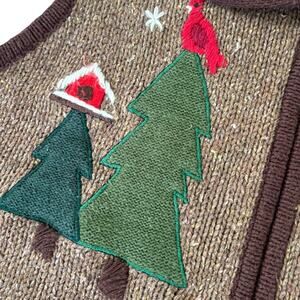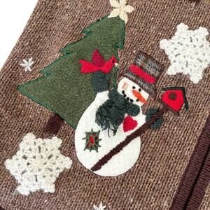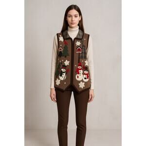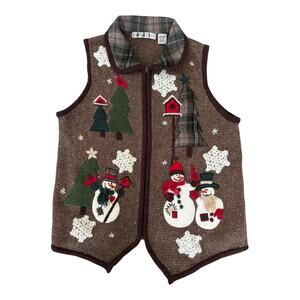 Vintage-style Christmas sweater vest featuring embroidered and appliqué snowmen, trees, cardinals, birdhouses, and crochet snowflakes on a brown knit base. Zip front closure with plaid collar lining adds cozy holiday charm. Perfect for festive gatherings, layering, or ugly sweater parties.