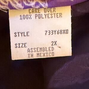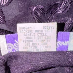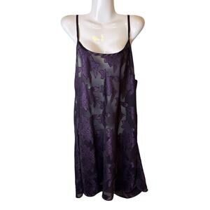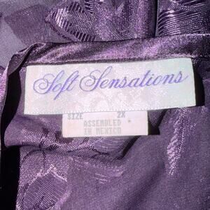 Vintage 1990s Soft Sensations sheer slip dress, size 2X. Deep purple floral mesh overlay with silky burnout texture, adjustable spaghetti straps, and unlined body. Pull-on style with bias drape. 100% polyester. Assembled in Mexico.