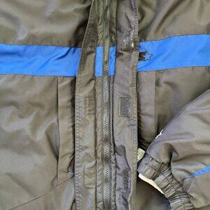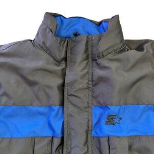 This vintage 90s Starter puffer jacket brings classic athletic style with serious warmth. Black with royal blue striping across the chest, back, and sleeves, it's lightly insulated with a down-feather blend and features both exterior and interior pockets. No hood included. A cozy, functional winter staple with retro flair.