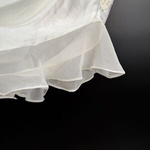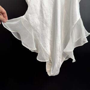 Elegant Victorias Secret satin teddy bodysuit from the 1990's. Features a luminous white satin body with sheer chiffon ruffle sides, delicate lace applique with sequin detailing, and adjustable straps for the perfect fit.