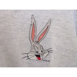 This is a vintage 90s Warner Bros. T-shirt featuring Bugs Bunny in solid gray color with short sleeves and a round neckline. It has a regular fit and is made of knit fabric with button accents. The T-shirt is unisex and comes in one size. The shirt is part of the Warner Brothers Collegewear collection and has a 90s theme. It is perfect for fans of Bugs Bunny and vintage clothing.