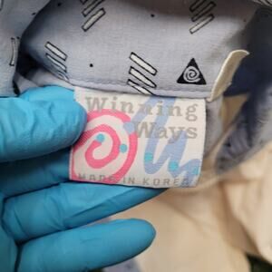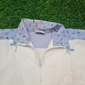 VTG 90s Winning Ways Vail Ski Windbreaker Anorak Jacket Mens L Cropped Boxy Fit Pullover Blouson Square Fit Saved By the Bell Style Fresh Prince Style Snowboard Apres Ski Indie Pastel White Baby Blue Pink Color Block Panelled Geometric Abstract All Over Print Half Zip Quarter Zip