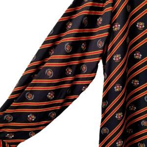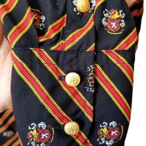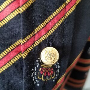 The top features a black background with a stripe shield logo pattern, a collared neckline and gold button closure.