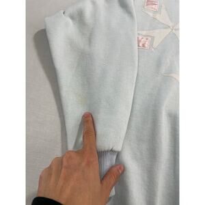 Step back into the vibrant 90s with this awesome vintage women's sweatshirt! Featuring a fun geometric pattern in blue and pink, this size L sweatshirt is a total statement piece.