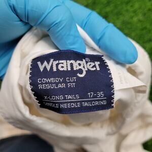 VINTAGE 90S WRANGLER COWBOY CUT WESTERN SHIRT XL, MADE IN USA WRANGLER PEARL SNAP 17X35, WRANGLER WHITE WESTERN SHIRT LONG TAILS, RODEO ROCKABILLY AMERICANA WRANGLER SHIRT, TAPERED LONG SLEEVE DOUBLE FLAP POCKETS, WRANGLER, PEARL SNAP, WESTERN SHIRT, COWBOY CUT, MADE IN USA