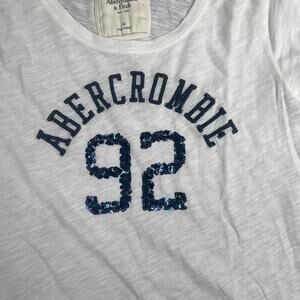 The product is a vintage 90s Y2K Abercrombie & Fitch thin burn out t-shirt for women in size M. The shirt features a round neckline, pullover closure, and short sleeves, made of knit fabric with sequin accents. It is styled in a basic white color with a solid pattern, representing the 90s theme and perfect for casual occasions during the summer and spring seasons. The brand Abercrombie & Fitch adds character to this slim-fit t-shirt, making it a stylish and trendy addition to any wardrobe.