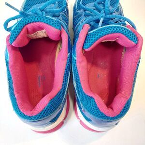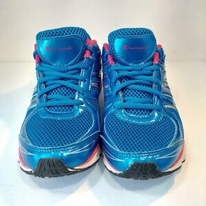 Retro vintage 90s Y2K Champion Electric Blue & Hot Pink Shift Running Sneakers Women's US Size 8.5 in excellent pre-owned condition with very minimal treadwear. Shoes come with original blue Champion box with tags. There is writing in black marker on the white info label, which can be easily removed. Measurements shown in photos.