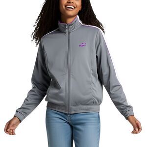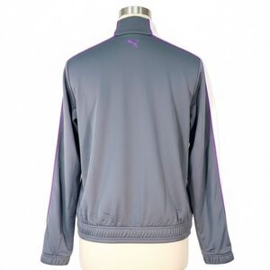 Retro rewind! Step out in true vintage 90s Y2K style with this authentic Puma activewear full-zip track jacket. The stylish sporty gray and white color-block with purple trim and pockets makes this piece a perfect, lightweight layering essential. Great athleisure streetwear or athletic sportswear for jogging / running workouts in Spring and Summer weather! Excellent pre-owned condition with no flaws.
