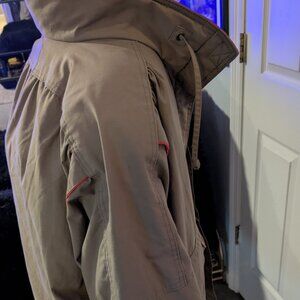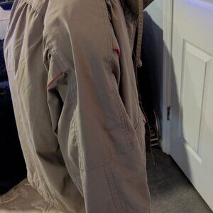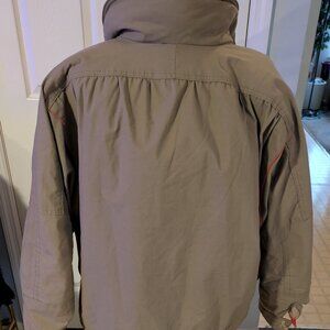 VTG 90's women's IZZI winter jacket orange/tan , size-large, pre-owned, good condition, puffy jacket, fall/winter, no stains, lite shearing to inner lining near right shoulder, shoulder pads in place, orange trim to collar and inner cuffs, 24in sleeve, jacket nice and warm, pit to pit-27 in, length-26 in, see photo