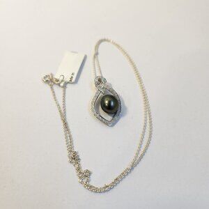VTG 925 10mm Floating Tahitian Cultured Pearl Pave Dangle Drop Pendant Necklace