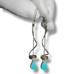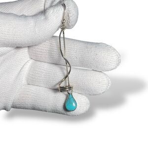Stunning vintage dangle earrings crafted in Mexico from 925 sterling silver, featuring a unique spiral design and teardrop turquoise stones. These 3" statement earrings offer a bold, modernist look with artisanal charm perfect for boho styling or gifting.
